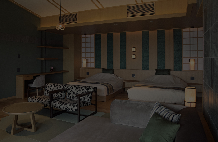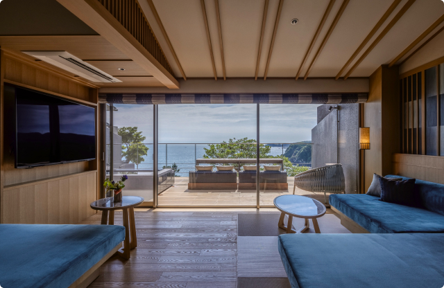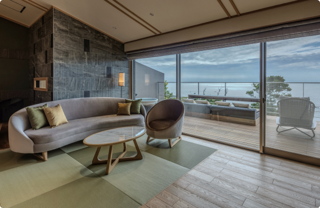 125平米の客室には、リビングルームとベッドルームのほか、12.5畳の和室を設け、さらにリラクゼーションチェアを備えた広いデッキは露天風呂へとつながっています。天候に恵まれた日には、ベッドルームから“日の出”をご覧いただけます。